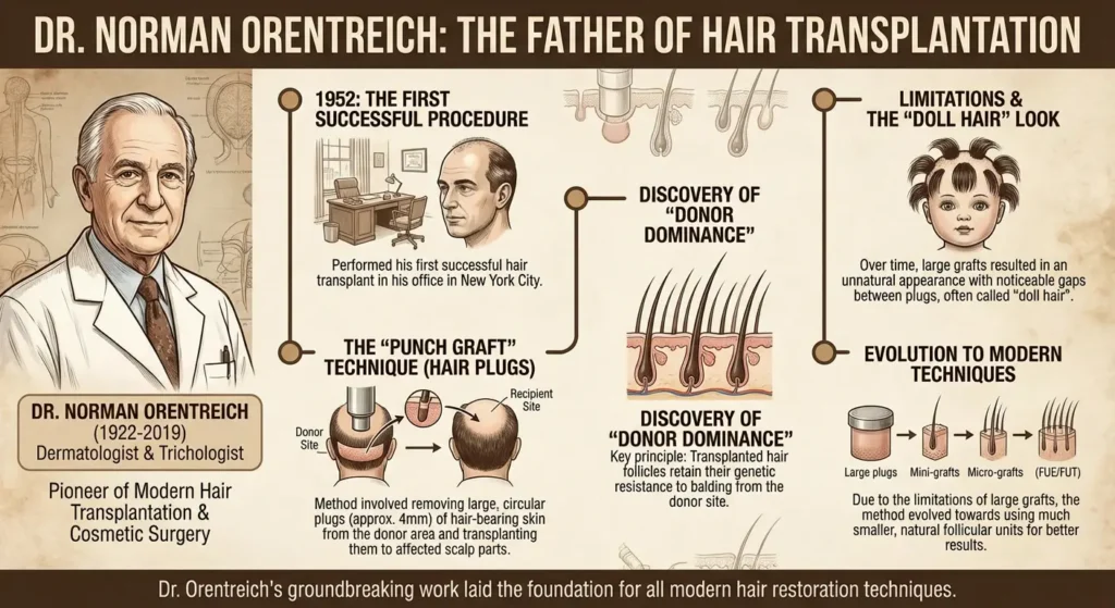 One of the renowned names in the history of hair transplants is Dr. Norman Orentreich. He is a dermatologist and trichologist and is considered the father of cosmetic surgeries. He performed his first successful hair transplant in 1952 in his office in New York. His technique of performing hair transplant involved removing small plugs of hair-bearing skin and transplanting them to the affected parts of the scalp. With time, this method resulted in an unnatural appearance, such as doll hair. Due to the large size of transplanted grafts, this method could not last for a long period of time.